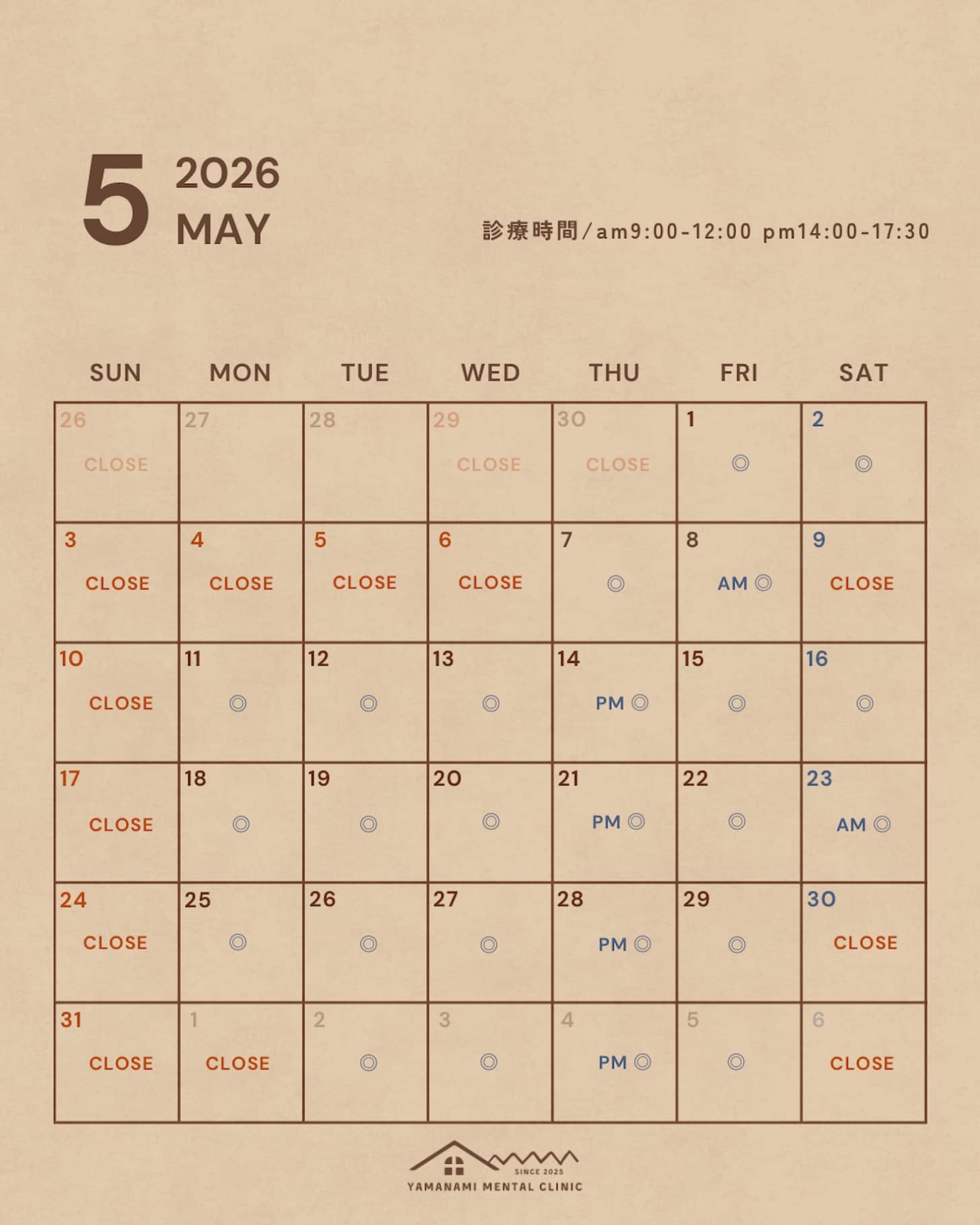 新年度が始まってはや1ヶ月が経過しようとしております。年度始めはなにかとバタバタして気分も落ち着かない時期です。GWで少し休息を取り連休明けからは心機一転と行きたいところです。毎度ギリギリでの更新となりますことをお許しください。5月の休診日カレンダーです。○土曜日が変則となり、第2土曜日、第5土曜日、そして第4土曜日の午後が休診○5/7木曜日は1日診療します○5/8金曜日は午前のみ診療、午後は休診となりますややこしい日程ですがご理解のほど宜しくお願いいたします。